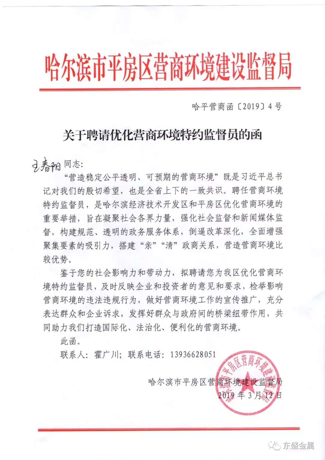 近日,哈爾濱市平房區(qū)營(yíng)商環(huán)境建設(shè)監(jiān)督局為強(qiáng)化社會(huì)監(jiān)督和新聞媒體監(jiān)督、構(gòu)建規(guī)范透明的政務(wù)服務(wù)體系、搭建“親”“清”政商關(guān)系,特聘哈東盛副總王春陽(yáng)同志為平房區(qū)優(yōu)化營(yíng)商環(huán)境特約監(jiān)督員。旨在及時(shí)反映企業(yè)和投資者的意見(jiàn)和要求,檢舉影響營(yíng)商環(huán)境的違法違規(guī)行為,宣傳推廣良好營(yíng)商環(huán)境,充分表達(dá)群眾和企業(yè)訴求,打造國(guó)際化、政治化、便利化的營(yíng)商環(huán)境。